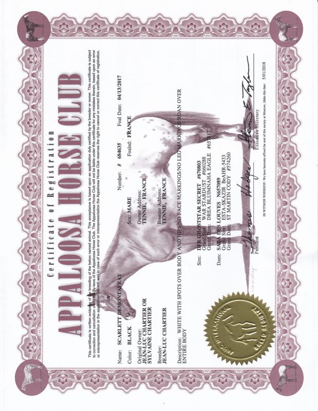 HYPP n/n, GBED N/N, MH n/n, Herda N/N, PSSM1 n/n, SCID/CA n/n (génétiquement sain et non-porteur des gènes défectueux)